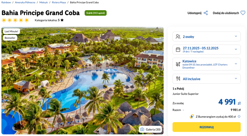 Bahia Principe Grand Coba położony jest w sercu Riviera Maya, wśród tropikalnej zieleni i blisko malowniczych plaż. Hotel działa w formule all inclusive, co oznacza pełne wyżywienie w formie smacznych bufetów oraz możliwość skosztowania dań à la carte w tematycznych restauracjach. Goście chwalą zarówno jakość jedzenia, jak i przyjazną obsługę oraz komfortowe pokoje.