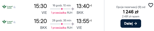 Podróż obejmuje przesiadkę w Rijadzie, jednak całość trwa około 16 godzin i 10 minut, co jest całkiem przyzwoitym czasem jak na podróż międzykontynentalną. Przesiadka nie powinna sprawić większych trudności, a komfort lotu pozostaje na zadowalającym poziomie.