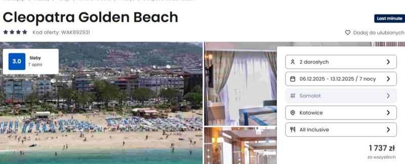 Misją Lastminuter.pl jest przedstawienie Ci najlepszych zdaniem naszej redakcji okazji na podróże. Opisujemy oferty znalezione przez nas w internecie i wskazujemy adresy internetowe, pod którymi samodzielnie możesz wykupić podróż lub elementy podróży. Ceny w artykułach są aktualne w chwili publikacji. Możemy otrzymywać wynagrodzenie od partnerów handlowych, do których Cię przekierowujemy. Nie ma to wpływu na cenę Twojej wycieczki. Powielanie publikacji zabronione.