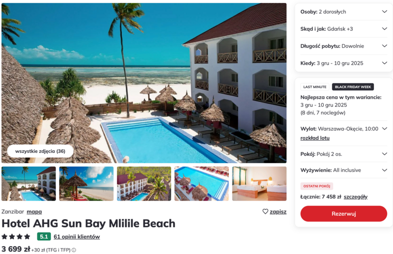 Wylot z Warszawy-Okęcia prosto na Zanzibar to świetny pomysł na oderwanie się od codzienności i spędzenie kilku dni w naprawdę wyjątkowym miejscu. Czeka tam na Ciebie czterogwiazdkowy hotel AHG Sun Bay Mlilile Beach, położony tuż przy prywatnej, piaszczystej plaży, gdzie możesz rozłożyć ręcznik i po prostu odpocząć. Oferta all inclusive sprawia, że nie musisz się niczym przejmować – wszystko jest już gotowe na Twój przyjazd.