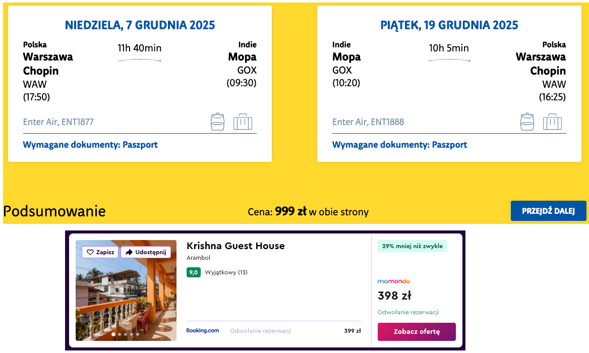 Cena i termin lotów sprawiają, że ta propozycja staje się naprawdę przystępna. Indie to kraj kontrastów – znajdziesz tu hałaśliwe metropolie, spokojne wybrzeża, górskie krajobrazy i miejsca z bogatą historią. Taki kierunek świetnie sprawdzi się na każdą okazję.Indyjska kuchnia, mieszanka kultur i niesamowita gościnność to coś, co zostaje w pamięci na długo. Każdy znajdzie tu coś dla siebie, a korzystna oferta przelotów z Warszawy to dobra okazja, by zamienić codzienność na coś naprawdę wyjątkowego.