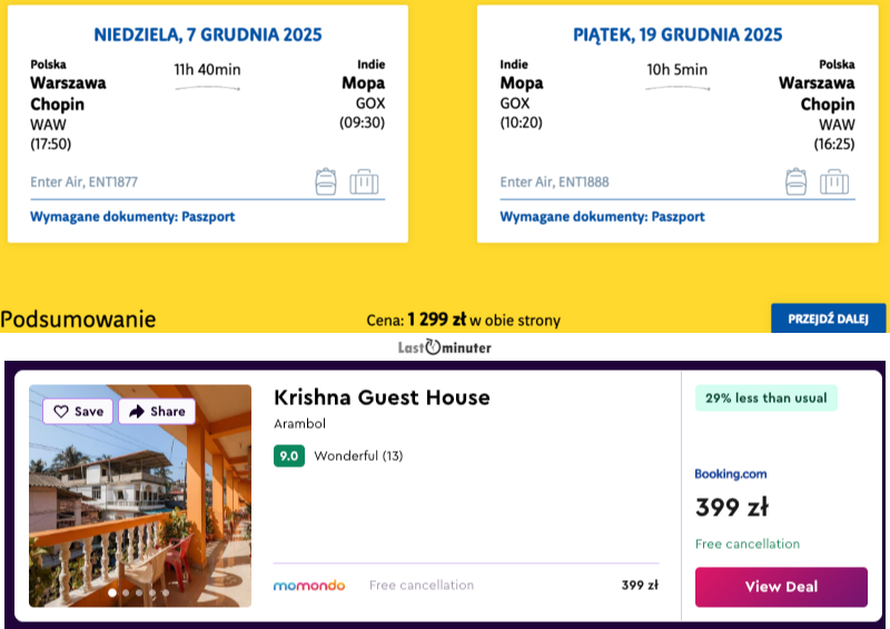 Cena i termin lotów sprawiają, że ta propozycja staje się naprawdę przystępna. Indie to kraj kontrastów – znajdziesz tu hałaśliwe metropolie, spokojne wybrzeża, górskie krajobrazy i miejsca z bogatą historią. Taki kierunek świetnie sprawdzi się na każdą okazję.Indyjska kuchnia, mieszanka kultur i niesamowita gościnność to coś, co zostaje w pamięci na długo. Każdy znajdzie tu coś dla siebie, a korzystna oferta przelotów z Warszawy to dobra okazja, by zamienić codzienność na coś naprawdę wyjątkowego.