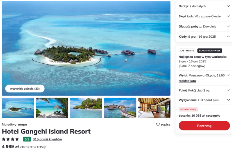 Planowany jest wylot z Warszawy-Okęcie na Malediwy, a konkretnie do kameralnego resortu Gangehi Island Resort. To idealna okazja, żeby oderwać się na chwilę od codzienności i zanurzyć się w spokojnej, egzotycznej atmosferze wyspy otoczonej turkusowym oceanem i miękkim, białym piaskiem.