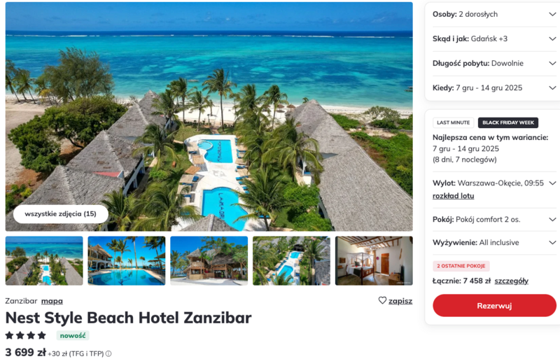 Wyloty na Zanzibar startują z Warszawy i Katowic, a na miejscu czeka klimatyczny czterogwiazdkowy Nest Style Beach Hotel. To propozycja dla tych, którzy chcą wypocząć bez zmartwień – opcja all inclusive obejmuje pełne wyżywienie i napoje serwowane o określonych porach.