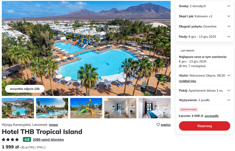 Wylot z Warszawy-Okęcia to świetny początek podróży na słoneczne Lanzarote – jedną z wyjątkowych Wysp Kanaryjskich. Na miejscu czeka THB Tropical Island – duży kompleks, który z łatwością zadowoli zarówno rodziny z dziećmi, jak i pary czy grupy znajomych szukające relaksu.