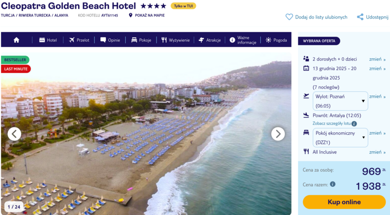 Wyloty z Poznania i Warszawy prowadzi prosto na słoneczne wybrzeże Riwiery Tureckiej, gdzie czeka hotel Cleopatra Golden Beach o czterech gwiazdkach. To miejsce, które kusi pakietem all inclusive – bez martwienia się o rachunki za lunch czy napoje, można po prostu rozkoszować się smakiem lokalnych (i nie tylko) potraw i koktajli.