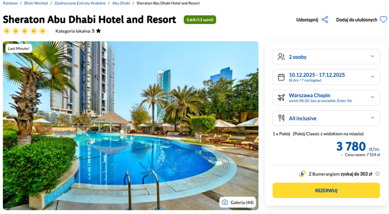 Wylot z Warszawy do Zjednoczonych Emiratów Arabskich to świetny sposób, żeby na moment uciec od jesiennej aury i przenieść się w słoneczne klimaty Abu Zabi. Czeka tam wypoczynek w eleganckim Sheraton Abu Dhabi Hotel and Resort, który zapewnia nie tylko doskonałą lokalizację, ale też pełen relaks dzięki formule all inclusive.