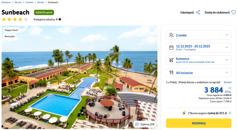 Wyloty zaplanowano z Katowic i Warszawy do Gambii, a konkretnie do położonego tuż przy plaży hotelu Sunbeach w miejscowości Bakau.