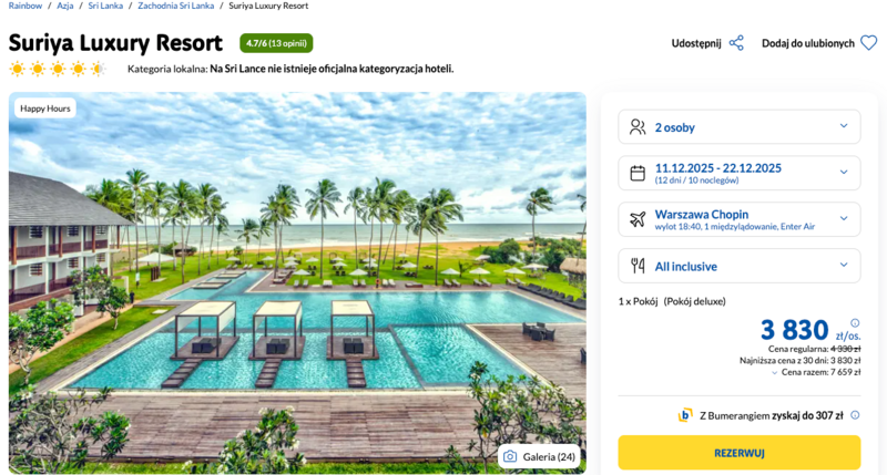 Podróże do Sri Lanki z Warszawy, Poznania i Katowic to świetna okazja, by zanurzyć się w świecie tropikalnych krajobrazów i lokalnej kultury. Wylot do Kolombo prowadzi do miejsca, które zachwyca nie tylko przyrodą, ale i komfortowym wypoczynkiem – a dokładnie do hotelu Suriya Luxury Resort w miejscowości Waikkal.