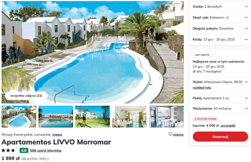 Wyjazd do Apartamentos LIVVO Morromar na Lanzarote to idealna okazja, żeby oderwać się od codzienności i złapać trochę słońca. Podróż rozpoczyna się na warszawskim Okęciu, a lądujemy prosto na jednej z najbardziej intrygujących wysp w archipelagu Wysp Kanaryjskich. Pobyt obejmuje formułę all inclusive, więc można zapomnieć o gotowaniu i skupić się wyłącznie na relaksie.