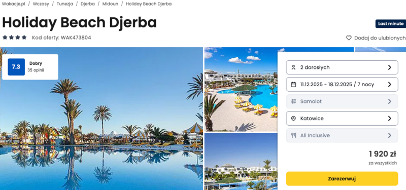 Holiday Beach Djerba to hotel chętnie wybierany przez turystów - za wygodne pokoje, miłą obsługę i korzystne warunki, jakie oferuje. Opinie pokazują, że to miejsce, w którym można dobrze spędzić czas, a cena, jak na oferowany standard, jest naprawdę atrakcyjna. To dobra opcja dla osób, które chcą odpocząć w pięknym miejscu bez nadmiernego obciążania swojego budżetu.