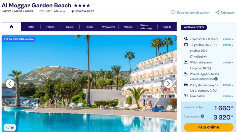 Wylot zaplanowano z lotniska Chopina w Warszawie do Agadiru, popularnego kurortu w Maroku. W ofercie znajduje się tygodniowy pobyt w hotelu Al Moggar Garden Beach, zlokalizowanym w pobliżu plaży i niedaleko centrum miasta, co może być dobrym punktem startowym do odkrywania okolicy.