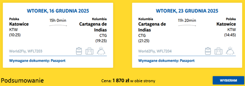 Tanie loty czarterowe z dużym bagażem do Kolumbii za 1870 zł