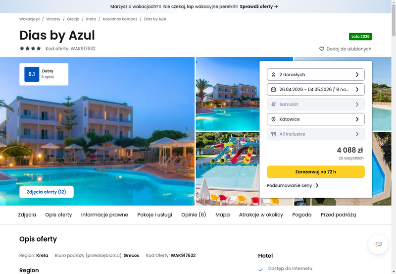 Aktualizacja: Majówka w Grecji: Kreta, bardzo dobry 4* hotel z all inclusive od 1859 zł