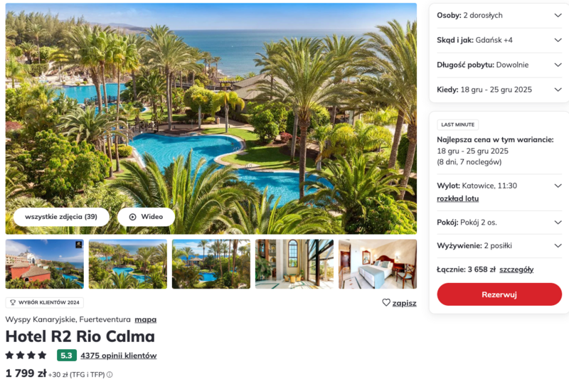 Na miejsce pobytu wybrano Hotel R2 Rio Calma, który już na pierwszy rzut oka robi wrażenie eleganckim, kolonialnym stylem i pięknym położeniem. Usytuowany na wzgórzu, oferuje widoki, które naprawdę zapadają w pamięć – rozciągające się wzdłuż wybrzeża plaże i turkusową wodę w tle. Na miejscu można korzystać z dużych basenów, w tym przyciągającego uwagę basenu infinity. Goście często zwracają uwagę na komfortowe warunki, dobre jedzenie i bardzo przyjazną obsługę. Dodatkowym atutem jest otoczenie – dobrze utrzymane ogrody i spokojna atmosfera sprzyjają wypoczynkowi.