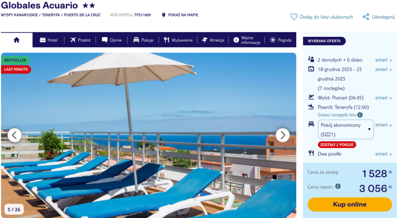 Jeśli szukasz niedrogiej opcji, by wyrwać się z zimowej codzienności i poczuć trochę wiosny, ta oferta może być ciekawą propozycją. Hotel Globales Acuario może nie spełni oczekiwań wymagających podróżników, ale sprawdzi się jako niedroga baza wypadowa do odkrywania uroków Teneryfy.