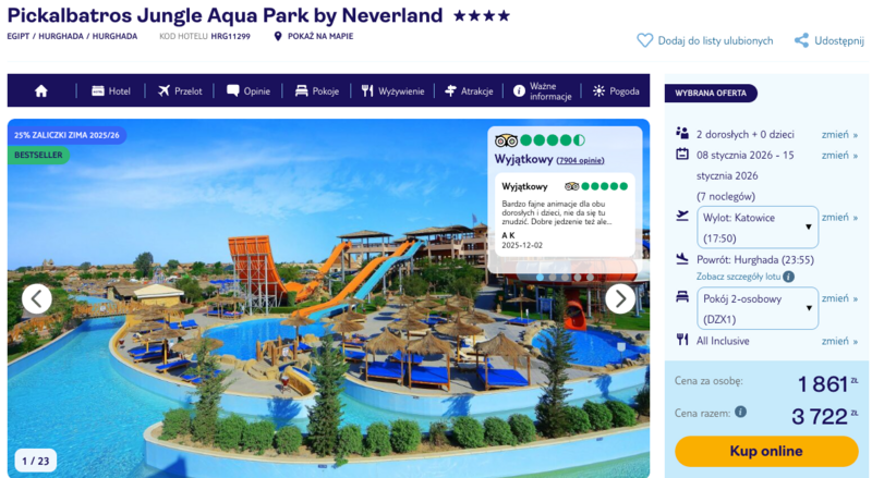 Na miejscu czeka czterogwiazdkowy hotel Pickalbatros Jungle Aqua Park by Neverland, znany z dużej ilości atrakcji, szczególnie dla fanów wodnych szaleństw. Ogromny aquapark z mnóstwem zjeżdżalni i basenów to prawdziwy raj, zarówno dla dzieci, jak i dorosłych. Do tego dochodzą liczne animacje i rozrywki, które skutecznie rozganiają nudę – nawet jeśli ktoś zazwyczaj trudno się rozkręca na wczasach.