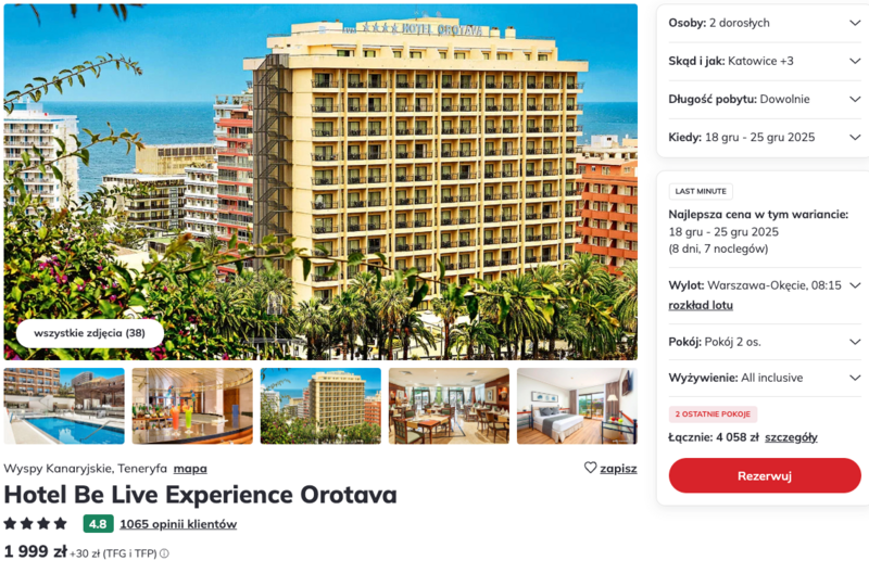 W ramach dostępnej oferty można zatrzymać się w czterogwiazdkowym hotelu Be Live Experience Orotava w Puerto de la Cruz. To wygodne miejsce dla tych, którzy cenią sobie spokojny wypoczynek, a jednocześnie chcą być blisko tętniącego życiem centrum miasta. Hotel oferuje przestronne pokoje, miłą obsługę i basen, który choć nie jest największy, zapewnia przyjemne miejsce do relaksu. Dodatkowym atutem jest niedaleka odległość do atrakcyjnych oceanicznych basenów Lago Martianez — idealnych na leniwe popołudnia.