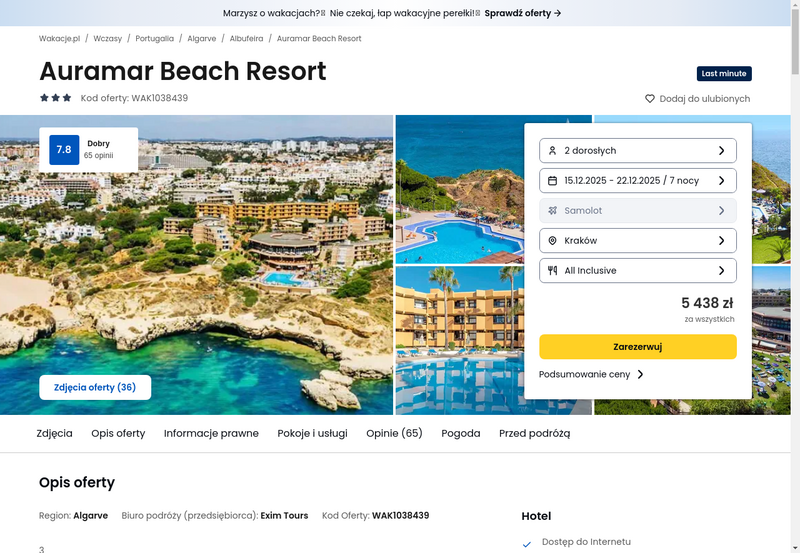 Aktualizacja: Portugalskie wybrzeże pełne słońca: Algarve, 3* hotel z all inclusive od 2169 zł