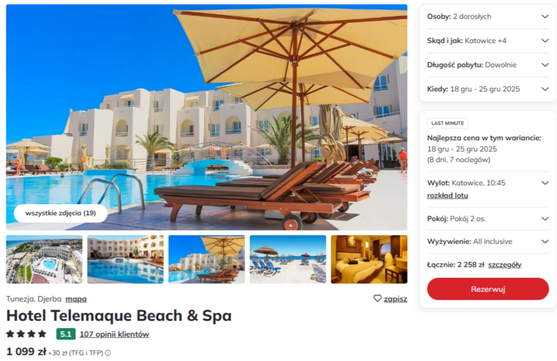 Cały wyjazd w formule all inclusive to wygodna i korzystna opcja – zarówno pod względem ceny, jak i tego, co w pakiecie. To dobry wybór dla tych, którzy szukają połączenia relaksu z możliwością aktywnego spędzania czasu – a wszystko to w jednym z najbardziej klimatycznych miejsc w Tunezji.