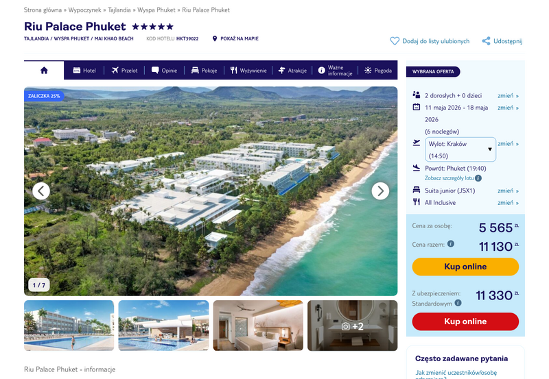 Na miejscu czeka komfortowy, 5* Riu Palace Phuket – resort, którego otwarcie zaplanowano na początek 2026 r. Stworzony z myślą o tych, którzy podczas wakacji cenią sobie wygodę i wysoką jakość. Opinie gości zwracają uwagę nie tylko na standard obsługi, ale też rozbudowaną ofertę kulinarną. W pakiecie all inclusive można korzystać z pięciu restauracji – w tym serwujących tajskie i włoskie specjały – oraz kilku barów, które działają przez całą dobę. Do tego temat kolacji zmienia się regularnie, a przekąski dostępne są w każdej chwili, co sprawia, że każdy posiłek może być przyjemnością samą w sobie.