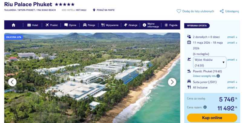 Na miejscu czeka komfortowy, 5* Riu Palace Phuket – resort, którego otwarcie zaplanowano na początek 2026 r. Stworzony z myślą o tych, którzy podczas wakacji cenią sobie wygodę i wysoką jakość. Opinie gości zwracają uwagę nie tylko na standard obsługi, ale też rozbudowaną ofertę kulinarną. W pakiecie all inclusive można korzystać z pięciu restauracji – w tym serwujących tajskie i włoskie specjały – oraz kilku barów, które działają przez całą dobę. Do tego temat kolacji zmienia się regularnie, a przekąski dostępne są w każdej chwili, co sprawia, że każdy posiłek może być przyjemnością samą w sobie.