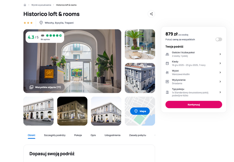 Podczas pobytu goście zatrzymują się w hotelu Historico Loft & Rooms, położonym w samym sercu Trapani. To miejsce łączy nowoczesny styl z przyjemną, swobodną atmosferą. Pokoje są wygodne i klimatyzowane, z dodatkowymi udogodnieniami, takimi jak Wi-Fi czy lodówka. Każdy dzień można tu zacząć od śniadania z regionalnymi przysmakami, które świetnie wprowadzają w lokalny klimat.