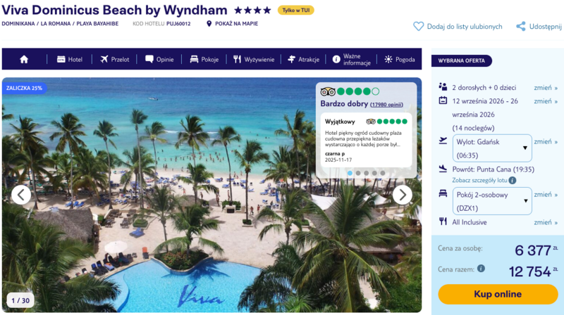 Na miejscu czeka Viva Dominicus Beach by Wyndham – hotel w La Romanie, położony tuż przy pięknej plaży. To miejsce, które łączy relaks z bogactwem atrakcji. W opcji all inclusive można liczyć na naprawdę smaczne jedzenie – od świeżo wypiekanej pizzy po kolacje tematyczne serwujące lokalne dania. Goście często wspominają nie tylko o różnorodności posiłków, ale też o przyjemnej atmosferze, która pozwala zapomnieć o wszystkim. Obsługa dba o dobre samopoczucie na każdym kroku, co sprawia, że można poczuć się tam bardzo komfortowo.