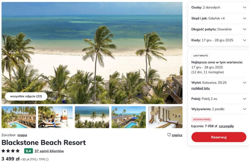 Wylot zaplanowany jest z Katowic, a celem podróży jest słoneczny Zanzibar i czterogwiazdkowy Blackstone Beach Resort.