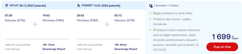 Wylot z Katowic do Mombasy zaplanowany jest na czas sylwestrowych wczasów, a sama podróż trwa nieco ponad 10 godzin.
