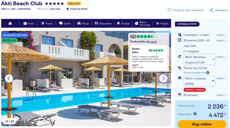Wylot z Warszawy na grecką wyspę Kos zaplanowany jest na popularny okres urlopowy, więc to świetny moment, by rozpocząć długo wyczekiwane wczasy. W ofercie znajduje się pobyt w hotelu Akti Beach Club, pięciogwiazdkowym obiekcie, który zyskał uznanie gości dzięki wysokiemu standardowi usług i relaksującej atmosferze.
