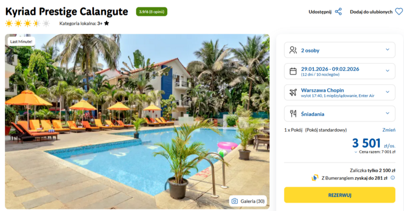 Na miejscu czeka 3* hotel Kyriad Prestige Calangute, położony w świetnej lokalizacji na północnym wybrzeżu Goa. To doskonały punkt, by zacząć zwiedzanie okolicy, a wieczorami odpocząć w jednej z licznych restauracji czy lokalnych knajpek. W hotelu można liczyć na różnorodne posiłki w formie bufetu, dostęp do Internetu, basen i przyjazną atmosferę. Goście często chwalą obsługę i komfortowe warunki, co zawsze dobrze wróży udanemu pobytowi. W tym czasie pogoda sprzyja wypoczynkowi – w ciągu dnia temperatury dochodzą do 29°C, a nocą spadają do około 23°C. Woda utrzymuje przyjemne 27°C – w sam raz na kąpiele i wszelkie wodne szaleństwa. Osoby, które lubią aktywnie spędzać czas, również znajdą coś dla siebie. Czeka tu mnóstwo sportów wodnych – od nurkowania, przez windsurfing po inne ciekawe formy spędzania czasu na plaży. A gdy już wystarczy wrażeń, wystarczy kilka kroków, by wrócić na relaksujący leżak z widokiem na ocean. Taka podróż to solidna dawka słońca, dobrego jedzenia i możliwości odkrywania nowej kultury. Z opinii innych turystów wynika, że to sprawdzony wybór – zarówno na odpoczynek, jak i aktywne zwiedzanie w pięknej, egzotycznej scenerii.