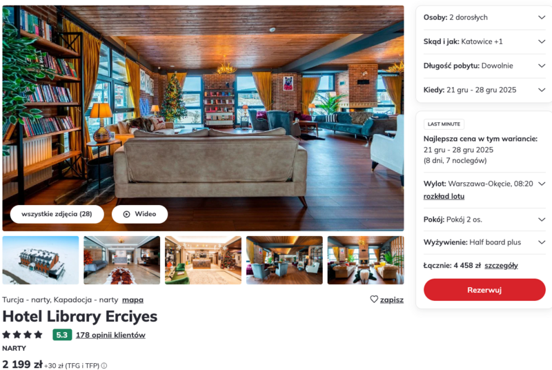 Wylot zaplanowany jest z Warszawy (Okęcie), a celem podróży jest nowoczesny i stylowy Hotel Library Erciyes w Turcji, położony w pobliżu popularnego ośrodka narciarskiego Erciyes.