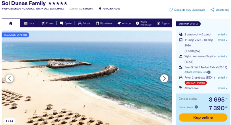 Lot z Warszawy na słoneczną Wyspę Sal to świetny sposób na odpoczynek w egzotycznym klimacie. Pobyt w 5-gwiazdkowym hotelu Sol Dunas Family w formule all inclusive to propozycja, która idealnie sprawdzi się, jeśli szukamy miejsca na relaks, ale też aktywny wypoczynek z rodziną.