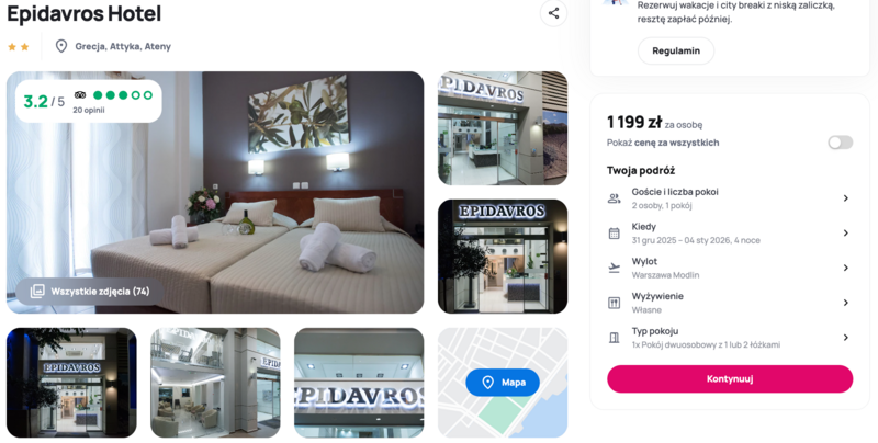 Wylot z Warszawy to świetna okazja, by poczuć klimat Grecji i poznać jej niezwykłą kulturę bez potrzeby planowania wszystkiego od A do Z. W planie pobytu zakłada się nocleg w hotelu Epidavros — prostym, dwugwiazdkowym obiekcie położonym w samym centrum Aten, skąd naprawdę łatwo dostać się do najważniejszych atrakcji.