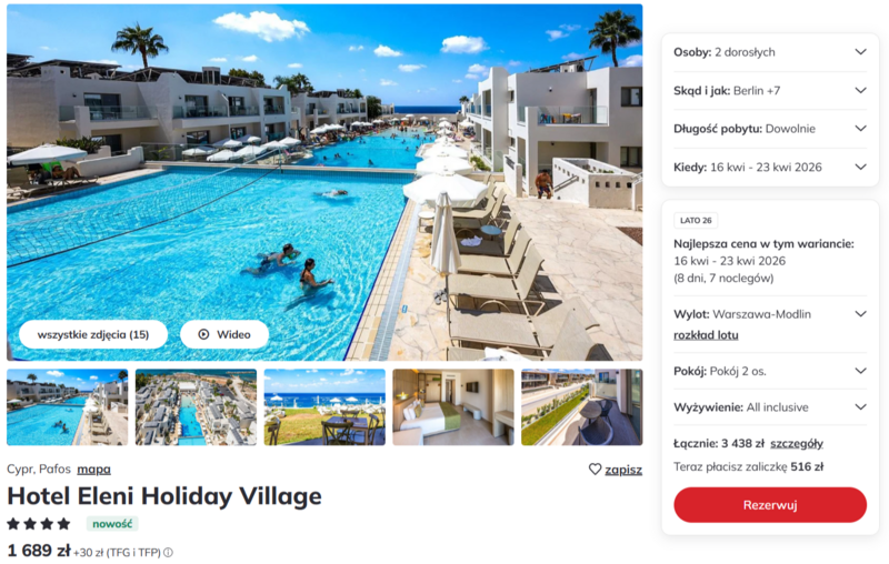 Podróż do Pafos wypada bardzo korzystnie także pod względem komfortu i zakwaterowania. Jedną z ciekawszych opcji jest Hotel Eleni Holiday Village – położony blisko słynnej plaży Coral Bay z Błękitną Flagą, oferuje baseny, animacje i dobrą lokalizację do zwiedzania okolicy.