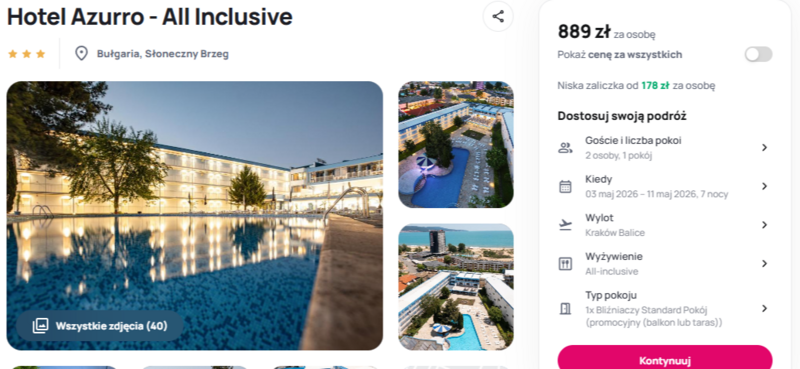 Wyloty z Krakowa i Warszawy prosto na bułgarskie wybrzeże – do popularnego Słonecznego Brzegu. Na miejscu czeka hotel Azurro, działający w formule all inclusive, co oznacza, że nie trzeba się przejmować dodatkowymi kosztami za posiłki i napoje – wszystko jest już w cenie.