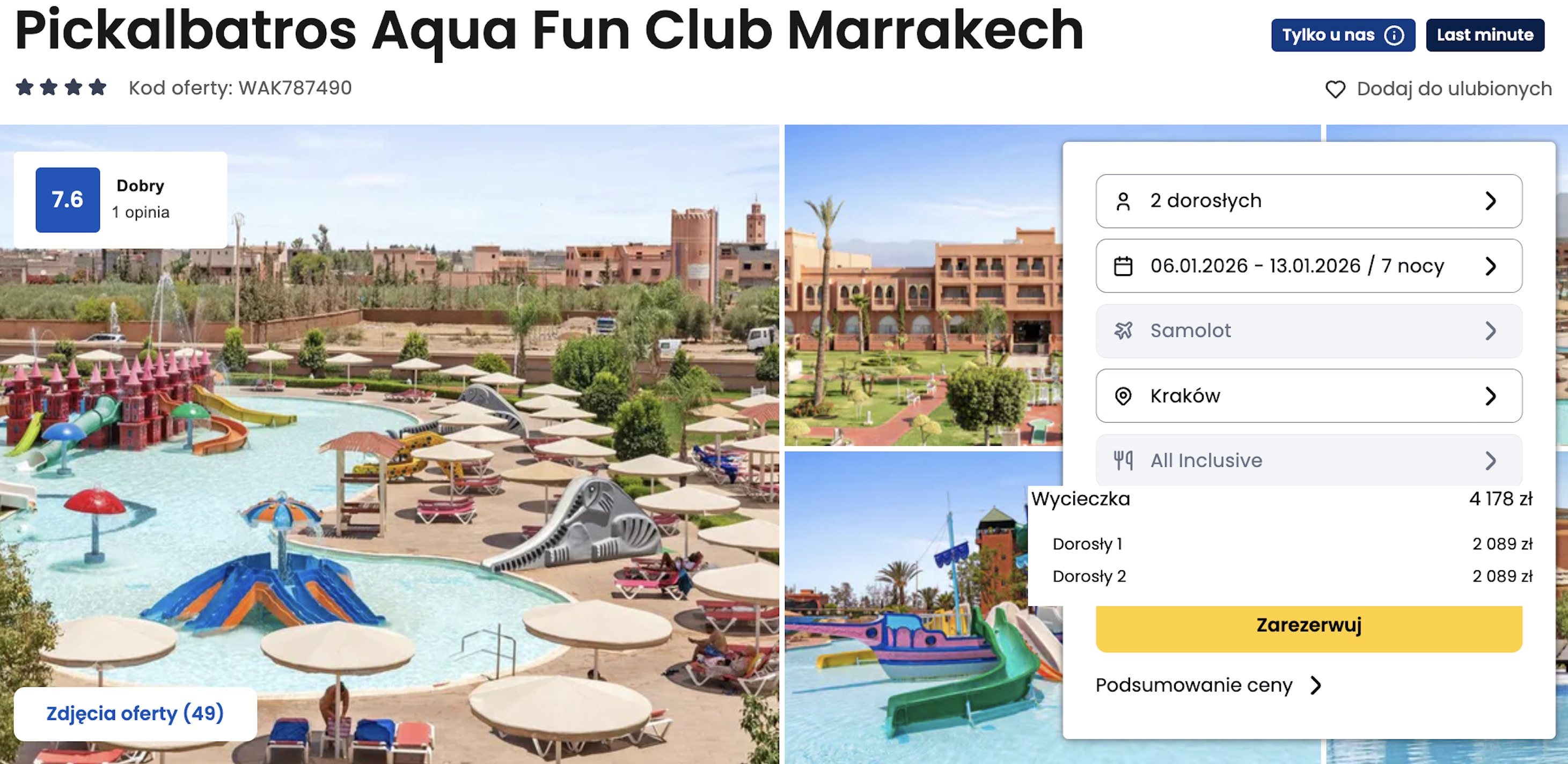 Wylot zaplanowany jest z Krakowa i Warszawy. Na miejscu czeka na Ciebie hotel Pickalbatros Aqua Fun Club Marrakech.