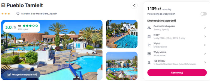 Hotel El Pueblo Tamlelt to trzygwiazdkowy obiekt w formule all inclusive, co oznacza wygodę i pełen relaks bez martwienia się o dodatkowe koszty. Położony blisko plaży, świetnie sprawdzi się na wypoczynek pod palmami i korzystanie z marokańskiego słońca. Opinie bywalców są różne, ale wielu docenia lokalizację i łatwy dostęp do lokalnych atrakcji – można wyskoczyć na zakupy na tętniące życiem bazary albo spróbować marokańskich specjałów w pobliskich restauracjach.