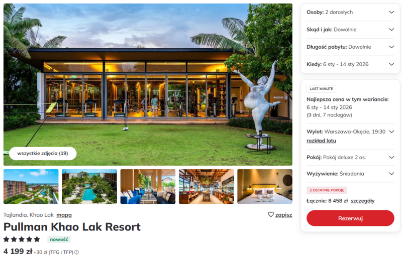 Na miejscu czeka pięciogwiazdkowy Pullman Khao Lak Resort – miejsce zaprojektowane z myślą o relaksie i wygodzie. Hotel znajduje się tuż przy piaszczystej plaży, a jego teren otaczają tropikalne ogrody i dwa duże baseny, w których można zanurzyć się z przyjemnością po dniu pełnym wrażeń. Dla rodzin z dziećmi przygotowano ciekawe animacje, które zapewnią najmłodszym mnóstwo atrakcji i dobrej zabawy. Wieczorem nie zabraknie rozrywki także dla dorosłych – restauracje, bary i pokazy ognia sprawiają, że każdy wieczór może być wyjątkowy.