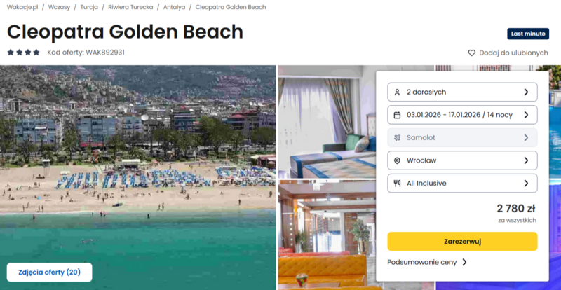 To wszystko sprawia, że Cleopatra Golden Beach może być interesującą propozycją dla tych, którzy chcą połączyć wypoczynek z odkrywaniem nowych miejsc. Cena, która nie wybija się ponad typowe wakacyjne standardy, w połączeniu ze sprawdzoną lokalizacją i opcją all inclusive, budzi zainteresowanie. Warto jednak zajrzeć do opinii innych podróżnych i samodzielnie zdecydować, czy to miejsce wpisuje się w Twoje oczekiwania.