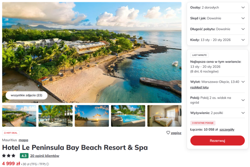 Wylot zaplanowany jest z Warszawy i prowadzi prosto na Mauritius, do hotelu Le Peninsula Bay Beach Resort & Spa.