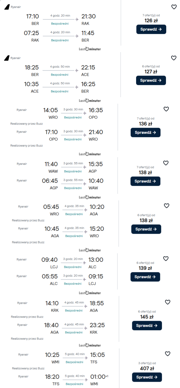 Agadir, Alicante, Lanzarote, Malaga, Marrakesz, Porto, Teneryfa, Wyspy Kanaryjskie, Berlin, Kraków, Łódź, Warszawa, Wrocław
