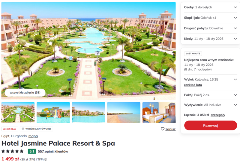 Wyloty do Hurghady z Katowic i Warszawy a na miejscu czeka hotel Jasmine Palace Resort & Spa – miejsce, które łączy wygodę, relaks i egipski klimat. To opcja dla tych, którzy chcą odpoczywać w dobrym standardzie i bez stresu o szczegóły, bo formuła all inclusive pozwala cieszyć się posiłkami, przekąskami i napojami przez cały dzień.