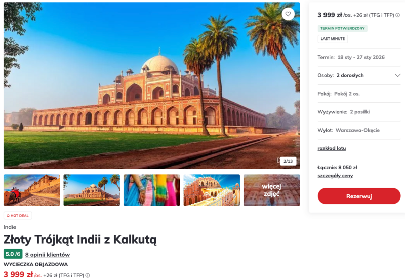 Podczas wyjazdu czeka na uczestników mnóstwo atrakcji – od tętniącego życiem Delhi, przez słynny Tadż Mahal w Agrze, aż po pełen uroku Dżajpur z imponującym Fortem Amber. Na trasie nie zabraknie też Kalkuty, która dzięki swojej historii i atmosferze często nazywana jest Klejnotem Wschodu. W planie są również wizyty w muzeach oraz przejażdżka rikszą po wąskich uliczkach Starego Delhi – atrakcja, która pozwala poczuć prawdziwy rytm miasta. Opinie uczestników wycieczki pokazują, że program wyjazdu jest dobrze przemyślany, a doświadczony pilot potrafi w ciekawy sposób przybliżyć bogatą historię oraz codzienne życie w Indiach.