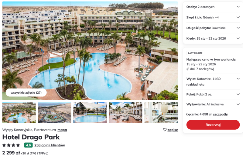 Wylot zaplanowany jest z Katowic, a celem podróży jest Costa Calma – spokojna i malownicza miejscowość na jednej z Wysp Kanaryjskich. Na miejscu czeka czterogwiazdkowy hotel Drago Park, idealny dla tych, którzy szukają wygodnego wypoczynku w przyjaznej atmosferze.
