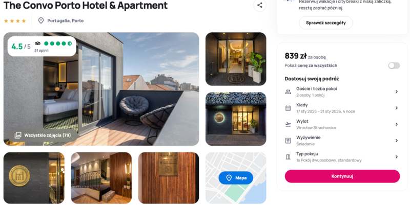 Na nocleg proponowany jest hotel The Convo Porto, który zbiera dobre opinie za lokalizację i udogodnienia. Goście doceniają wygodne pokoje i sympatyczną, pomocną obsługę, która chętnie podpowie, co warto zobaczyć w okolicy. Pozytywna ocena za czystość i szybki internet sprawiają, że hotel stanowi wygodną bazę na czas zwiedzania.