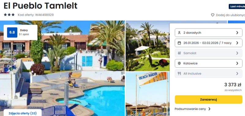 Zatrzymasz się w 3* hotelu El Pueblo Tamlelt z wygodną opcją all inclusive. Obiekt cieszy się dobrą opinią wśród turystów – goście chwalą przyjazny personel, czyste pokoje i świetną lokalizację tuż przy szerokiej, piaszczystej plaży. Wszystko to sprawia, że pobyt naprawdę potrafi zrelaksować.