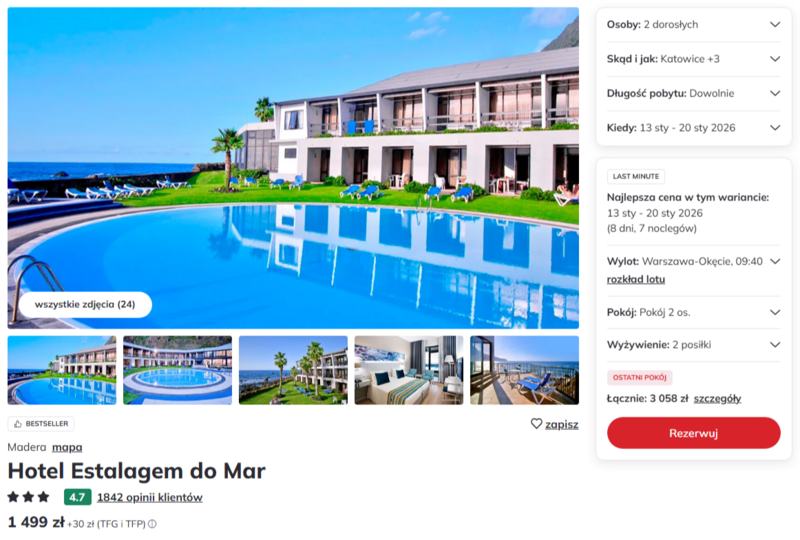 Wylot z Warszawy-Okęcia prowadzi prosto na Maderę – wyspę o bujnej zieleni, spektakularnych widokach i przyjemnym klimacie przez cały rok. Na miejscu czeka Hotel Estalagem do Mar – 3* obiekt położony tuż nad oceanem. To właśnie lokalizacja przyciąga gości – dźwięk fal, świeże powietrze i odprężająca cisza sprawiają, że można naprawdę odpocząć.