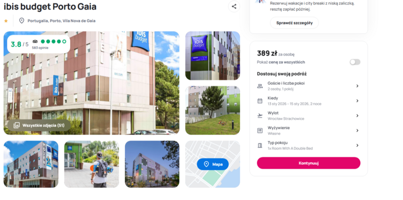 Na czas pobytu przewidziano noclegi w hotelu znanej sieci ibis budget Porto Gaia. To miejsce, które zbiera dobre opinie od podróżnych – zarówno za czystość i wygodę, jak i za lokalizację. Hotel położony jest niecałe 500 metrów od rzeki Douro, dzięki czemu można łatwo wybrać się na spacer do centrum czy odwiedzić ciekawe punkty na mapie Porto. Wiele osób podróżujących z dziećmi chwali sobie również przyjazną atmosferę i dobry standard w przystępnej cenie.